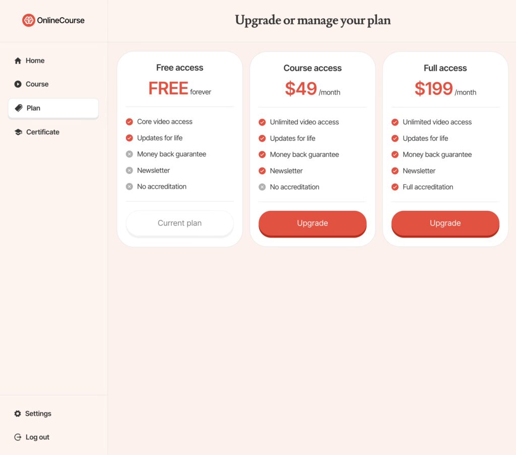 • 3 different plans – free, paid, and premium with content gated according to plan level